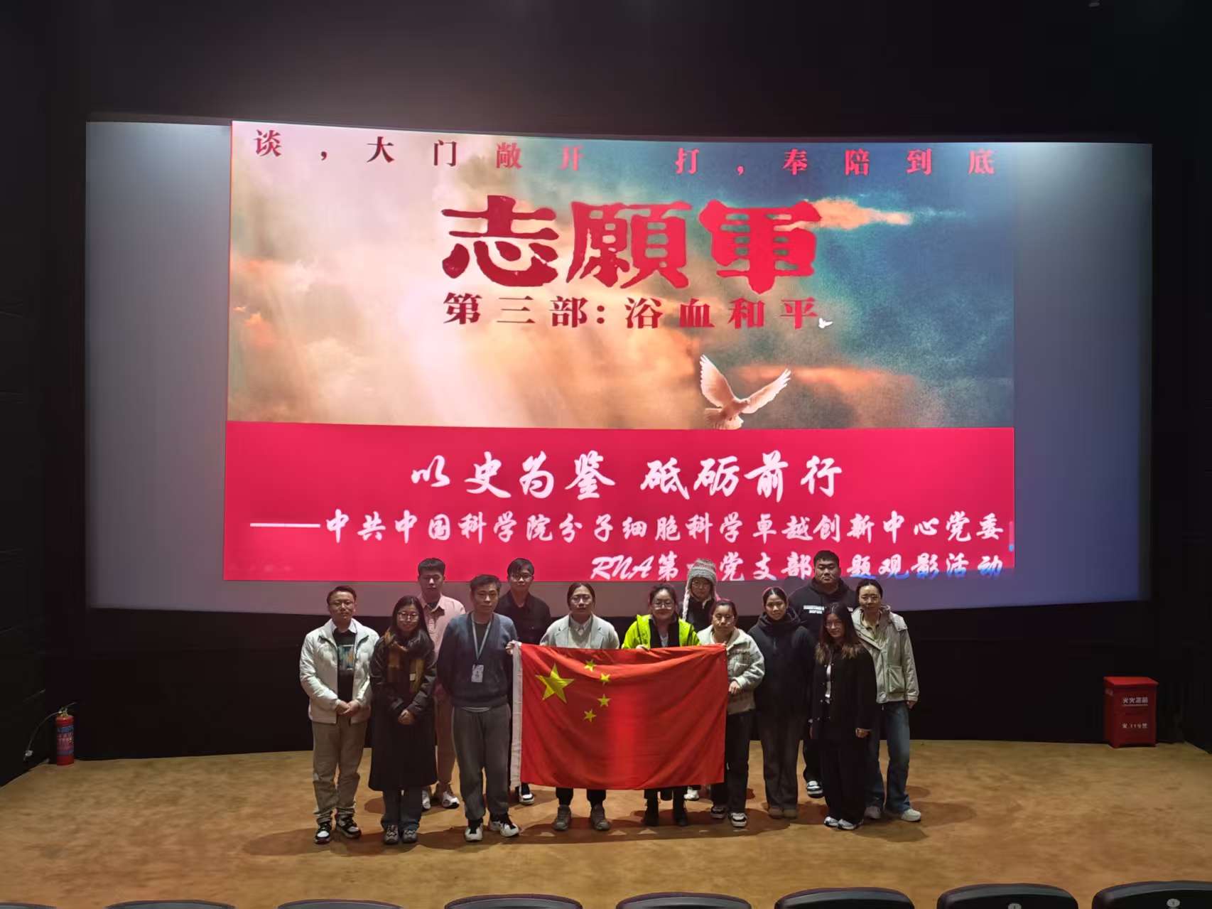 会后,党员们集中观看了爱国主义影片《志愿军:浴血和平》,影片重现了志愿军为了和平展现的大无畏精神,震撼了每一位观影者。大家心潮澎湃,纷纷表示被志愿军攻坚克难的斗志鼓舞和激励,在今后的科研工作中,将会以更加昂扬的姿态和扎实的行动,在RNA生命科学领域的研究中奋力攻坚,为加快实现高水平科技自立自强、建设科技强国做出新的更大贡献。
