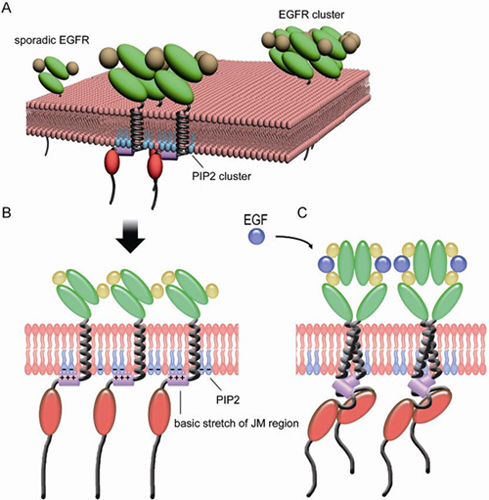 离子型蛋白-磷脂相互作用介导的EGFR蛋白质膜成簇模型示意图