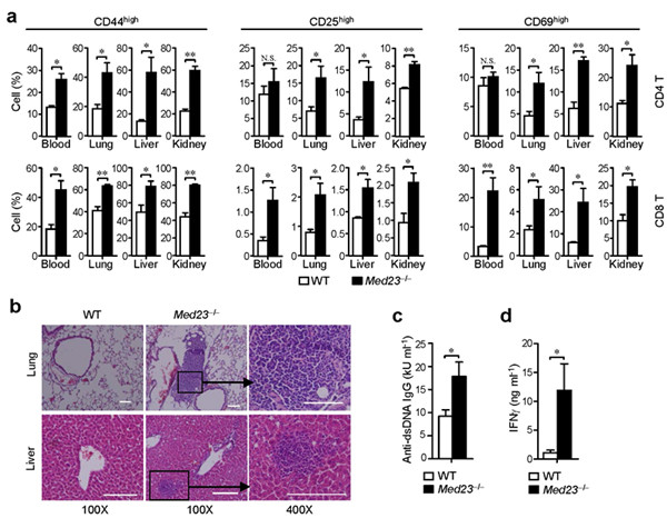 图示:Med23缺失导致年老小鼠出现自身免疫病症状。(a)外周血和相应器官T细胞表面CD44、CD25和CD69的表达。年老小鼠肺脏和肝脏组织化学切片(b)以及血清中抗自身ds-DNA抗体(c)和IFNγ的含量(d)。