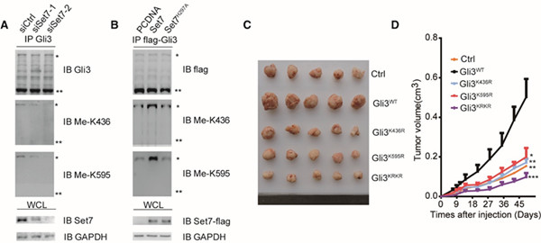 在赵允研究员的指导下,博士研究生傅琳首先通过质谱检测发现Gli3的第436位和第595位赖氨酸可以被甲基化修饰。进一步的分析表明,这两个位点有可能是潜在的Set7甲基化位点。随后的体外甲基化实验证实了这两个位点可以被Set7特异性修饰,并发生甲基化。进一步通过制备针对这两点的甲基化抗体,在体内证实了这种修饰的发生。研究表明,甲基化仅仅在Gli3的全长形式Gli3A发生,而Gli3的截短抑制形式Gli3R尽管存在甲基化位点,但不会被Set7说修饰。深入的机制研究表明,Set7所介导的Gli3甲基化修饰能够在Shh存在情况下正向调控Shh信号通路活性。具体来说,436位点的甲基化增强了Gli3的蛋白稳定性而595位点的甲基化提高了Gli3结合Gli1等下游靶基因的能力。同时Shh信号通路的激活可以进一步促进Set7的表达,从而形成一个正反馈调节。动物实验证明,甲基化修饰增强了Gli3的oncogenesis能力,促进了肿瘤的生长和迁移。这一工作由于首次发现Gli分子,特别是Gli3的甲基化,以及Set7这种较为重要的组蛋白甲基化酶对Shh信号通路的非表观遗传调控方式,从而为进一步研究Hh信号通路在癌症,特别是肺癌发生、发展过程的分子机制提供了较为坚实的基础。同时也为人类相关疾病的临床诊治及药物研发提供潜在的靶点。