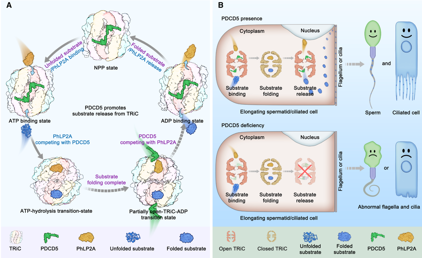 蛋白质需要正确折叠以发挥其生物学功能。TRiC(又称CCT)是真核生物中特有的II型分子伴侣素,负责协助折叠约10%的胞质蛋白(如微管蛋白tubulin、肌动蛋白actin、细胞周期调控因子CDC20等),对维持细胞内蛋白质的稳态至关重要。TRiC由两个相同的异源八聚体环背对背堆叠而成,在ATP的驱动下通过“开放–闭合”的构象循环,有序完成底物蛋白的招募、折叠与释放。此外,多种辅助伴侣蛋白或辅因子可协助向TRiC递送未折叠底物或介导其折叠过程。然而,TRiC在完成底物折叠后如何释放底物,一直是该领域内悬而未决的关键科学问题。此前研究发现,程序性细胞死亡蛋白 5(PDCD5)可与开环构象的TRiC结合,但二者结合的精确分子机制及生理意义仍不清楚。