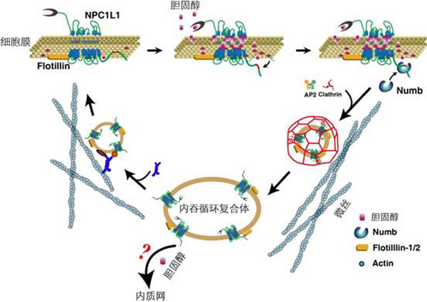 在宋保亮研究员的指导下,博士研究生李培山等利用体细胞遗传学的方法鉴定出NPC1L1蛋白的C端有一个特异性内吞序列。进而通过酵母双杂交筛选出与该序列直接结合的蛋白Numb。Numb通过连接NPC1L1-C和Clathrin,从而介导NPC1L1和胆固醇的内吞。在细胞中基因沉默Numb后显著减慢NPC1L1的内吞和胆固醇的吸收。进一步,他们发现低胆固醇水平时,内吞序列结合质膜。NPC1L1蛋白N端结构域结合胆固醇后,NPC1L1发生构象变化,其C端的内吞序列从质膜中暴露出来,结合Numb,进而招募AP2和Clathrin等,起始NPC1L1的内吞。利用小肠组织特异性Numb基因敲除小鼠作为模型,他们发现该小鼠从肠道中吸收胆固醇的量明显减少,血液胆固醇水平也下降。并且该小鼠能够有效抵抗饮食诱导的高胆固醇血症。在小鼠体内表达多肽竞争NPC1L1-Numb的结合,可有效抑制胆固醇吸收。该研究深入揭示了小肠胆固醇吸收的分子机制,并为发展新型降胆固醇药物提供了策略。