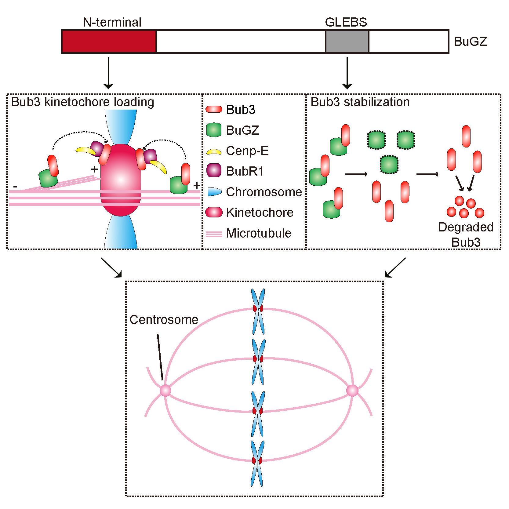 朱学良研究组的博士研究生姜昊和何骁男利用超高分辨率荧光显微术等技术证明,与微管侧面结合的动粒实际上比未结合微管或已稳定结合微管的动粒含有更多的检查点蛋白质。而且,他们和其他同事一道在利用小鼠胚胎干细胞所进行的筛选中发现一个能够影响有丝分裂的锌指蛋白BuGZ。该蛋白质定位于纺锤体上,是一个纺锤体基质(spindle matrix)蛋白质。在细胞内干扰BuGZ的功能会引起动粒与微管稳定结合效率的下降,导致染色体排列散乱、有丝分裂阻滞和细胞死亡。深入的研究发现,BuGZ能直接结合Bub3并保护细胞浆中的Bub3不被降解,维持Bub3蛋白质的较高水平。BuGZ还能直接结合微管,而且这种结合可以促进Bub3以及BubR1和Cenp-E在与微管侧面结合的动粒上的定位,从而有利于动粒实现向正面结合微管的状态的快速转变。该研究成果不仅揭示了保障有丝分裂高效性的一种新机制,还揭示了纺锤体基质这一近年发现的新结构的新功能。