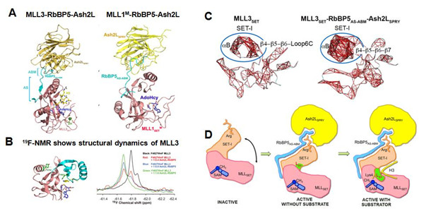 图示:MLL家族蛋白的甲基转移酶活性调控机制研究 (A) MLL1 和MLL3 复合物晶体结构;(B) MLL3 溶液结构的动态性;(C) 分子模拟MLL3 SET-I 模块的柔性;(D) MLL甲基转移酶活性调节模型。