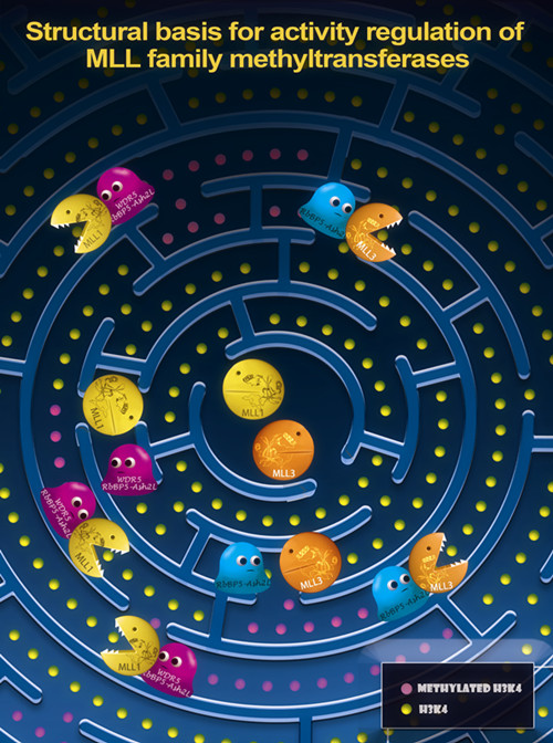 以基因组DNA 和组蛋白的共价修饰为主要标志的表观遗传调控研究已成为生命科学前沿快速发展的热点领域,其中组蛋白甲基化对于基因的转录表达,细胞增殖分化等起着至关重要的调控作用,相关甲基化酶基因的突变会异常会导致多种遗传疾病和癌症。组蛋白H3第4位赖氨酸的甲基转移酶MLL1就因为其基因易位重排所引起的混合系白血病(Mixed Lineage Leukemia)而得名,与造血功能密切相关。MLL家族蛋白(MLL1/2/3/4,SET1A/B)是一类特异性针对H3K4的甲基转移酶,其甲基转移酶活性依赖于C末端的一个保守的SET结构域。前人实验发现,MLL家族蛋白与其他具有SET结构域的甲基转移酶不同,它行使功能需要多个辅助蛋白WDR5,RBBP5, ASH2L组成复合体才能有效的完成甲基化修饰过程。由于缺乏原子分辨率的结构,整个复合物如何有效的实现甲基化修饰一直处于争论之中,MLL家族蛋白是否采用了相同或者不同的活性调控机制也是不得而知。