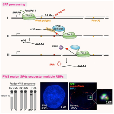 SPA加工产生机制模型(上图)及PWS区域lncRNAs在iPS细胞(PWS病人来源、正常人来源)中定位(下图)。