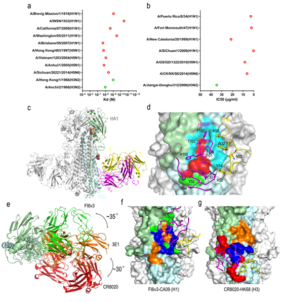 图1. 3E1中和H1和H5亚型流感病毒,识别血球凝集素颈部表位。a. 3E1识别H1和H5亚型血球凝集素。b. 3E1中和H1和H5亚型流感病毒。c. 3E1识别血球凝集素颈部表位。d. 3E1识别表位分为融合亚结构域(青)、融合肽(红)和外缘β折叠(绿)。e. 3E1识别角度位于两种广谱中和抗体之间。f. 3E1与类型一抗体识别表位50%以上重叠(蓝)。g. 3E1与类型二抗体识别表位50%以上重叠(蓝)。