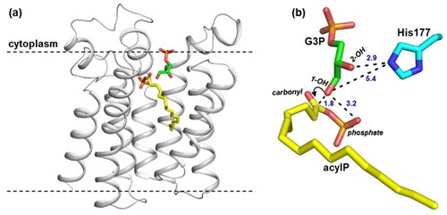 PlsY的结构与催化机制。(a)两个底物在PlsY酶活性中心的相对位置。(b)“底物协助催化”机制。文献中认为组氨酸对甘油三磷酸进行去质子化继而引起酸碱催化反应,但结构显示组氨酸177与sn-1位羟基距离太远,不可能进行去质子化。组氨酸的这一功能由底物脂酰磷酸的磷酸头部部分完成,因此被称为“底物协助催化”。需要说明的是,两个底物来自两个不同的结构。