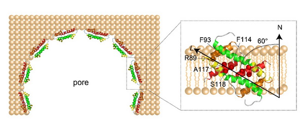 细胞凋亡是维持细胞数量动态平衡的重要手段,凋亡失常将导致许多疾病的发生。Bax是一个关键的促细胞凋亡蛋白,在调控线粒体凋亡途径中发挥着不可或缺的作用。正常情况下,Bax是以单体形式静存于细胞基质中。当细胞接收到凋亡信号后,Bax会被激活并在线粒体膜中形成多聚体孔洞,释放细胞色素C,从而起动凋亡程序。Bax单体是一个由九个α螺旋组成的球状蛋白,激活后会将疏水的α9螺旋释放出来与线粒体膜结合。然而Bax在膜上的状态是什么样的,是如何形成孔洞来改变线粒体通透性进而促进细胞凋亡的,长期以来没有得到解答。
