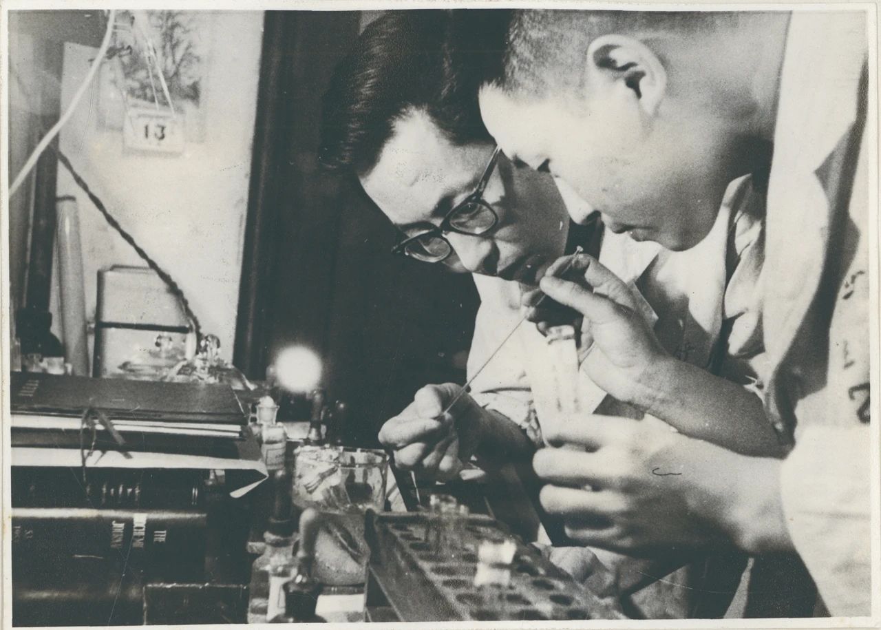 生化所龚岳亭(左)、蒋荣庆观察人工合成牛胰岛素B链和天然牛胰岛素A链重组半合成胰岛素的结果。