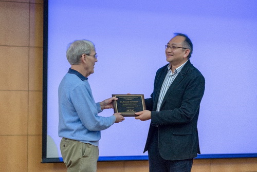 Richard Henderson用精彩的报告,同与会人员分享了Electron cryomicroscopy的原理、冷冻数据质量的提高和前沿进展,以及对未来发展前景的展望。针对生化与细胞所的学科发展需求,他还着重讲解了冷冻电镜的发展历程,并用生动的例子介绍了此项技术在结构生物学中的应用,以及单颗粒冷冻电镜数据在分辨率上的逐步突破。讲座吸引了生化与细胞所及其他研究机构的众多中外师生员工前来聆听,现场反响热烈。听众在现场与Richard Henderson积极互动,频频提问;Richard Henderson则耐心解答每一个问题。报告结束后,陈剑峰研究员向Richard Henderson颁发了王应睐讲座证书。