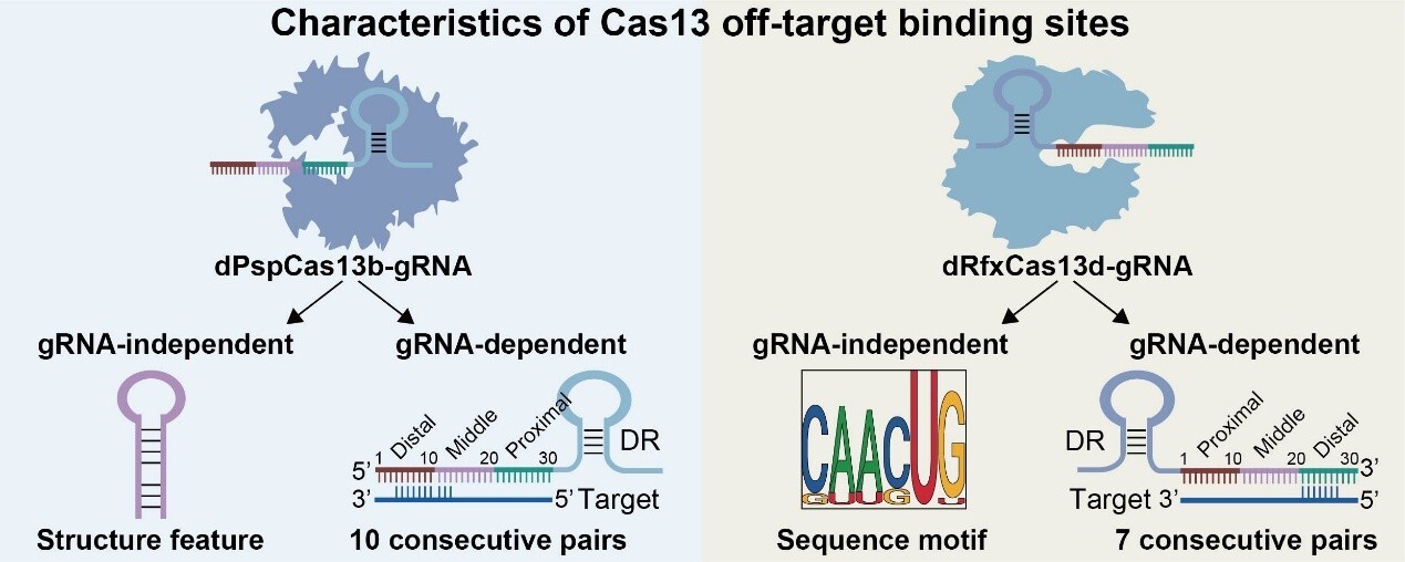研究人员运用uSpyCLIP技术,绘制出dPspCas13b-gRNA和dRfxCas13d-gRNA复合物在转录组中的结合位点分布图谱。研究显示,dCas13的结合行为比先前预想的更为广泛。两种dCas13-gRNA复合物均呈现大量的脱靶结合事件。根据其是否依赖于gRNA,可以分为gRNA依赖性的(gRNA-dependent)脱靶和gRNA非依赖性的(gRNA-independent)脱靶。进一步地,研究人员对两种dCas13-gRNA复合物的脱靶结合行为进行了表征和验证,证实dCas13蛋白的gRNA非依赖性脱靶位点具有独特的RNA识别位点结构和序列特征:dPspCas13b的脱靶结合与特定RNA结构特征相关,而dRfxCas13d的脱靶结合则与特定的序列基序相关。对gRNA依赖性脱靶位点的分析发现,gRNA的DR远端区和中部区域在决定结合特异性中的关键作用:PspCas13b gRNA间隔区前20个核苷酸中10个碱基的完全配对足以介导结合,而RfxCas13d gRNA间隔区第11-30个核苷酸中7个碱基的完全配对则足以介导结合。进一步研究发现,以上部分脱靶事件能够导致非靶标基因的mRNA和/或蛋白质水平基因表达发生变化。这些结果表明,基于dCas13或dCas13-效应子融合蛋白的应用,例如转录后调控、RNA成像和RNA编辑,可能会因脱靶结合而产生复杂的毒副作用。此项研究为检测Cas13的脱靶结合位点提供了全新的技术手段与研究策略,深化了对Cas13系统的认知,为特异性gRNA的合理设计以及Cas蛋白的工程改良提供了重要的理论基础和支撑。