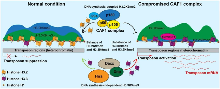 转座子广泛存在于真核生物基因组中,其异常激活和转座可引发基因组不稳定,甚至导致发育异常、衰老相关改变及遗传疾病。因此,细胞需要依赖DNA甲基化和组蛋白翻译后修饰等表观遗传机制对转座子实施严格抑制。既往研究表明,组蛋白H3不同变体及其伴侣蛋白在染色质组装和异染色质维持中发挥重要作用。其中,DNA复制偶联(DNA synthesis-coupled,DSC)途径主要负责经典H3.2的装配,而DNA复制非依赖(DNA synthesis-independent,DSI)途径则主要介导H3.3的装配。然而,在体细胞发育过程中,究竟哪一条通路在转座子抑制中发挥主导作用,以及不同H3变体修饰如何协同建立异染色质,仍有待深入阐明。