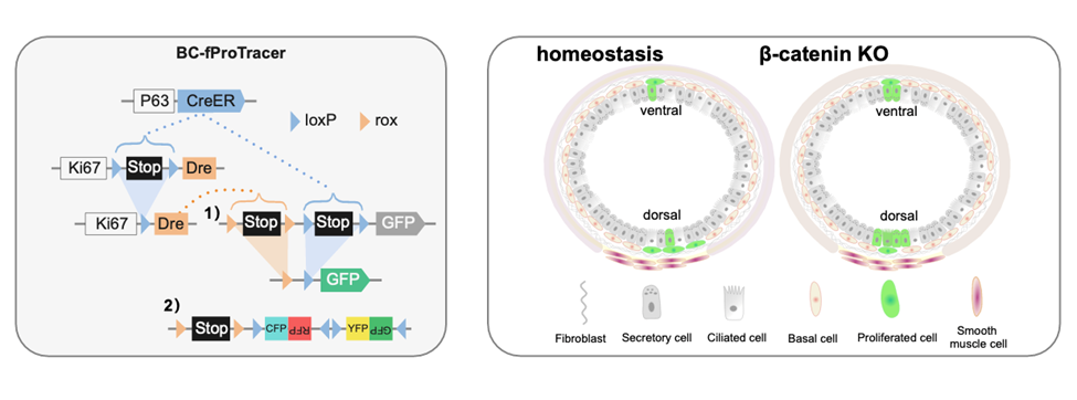 基底细胞增示踪工具BC-fProTracer的工作原理示意图,该系统由三部分组成:P63-CreER;Ki67-L-Dre/+;Reporter (该研究使用了两种报告基因:1) R26-RL-GFP; 2) R26-Confetti2)。Tam诱导后,基底细胞中P63-CreER入核与Ki67-L-Dre转变后的Ki67-Dre共同驱动R26-RL-GFP或R26-Confetti2的表达来标记增殖的基底细胞。稳态下,基底细胞增殖主要富集在气管背侧,同时基底细胞增殖在背侧腹侧产生少数杯状细胞。敲除β-catenin后,基底细胞增殖产生新的基底细胞减少,而增殖产生的杯状细胞则变多。