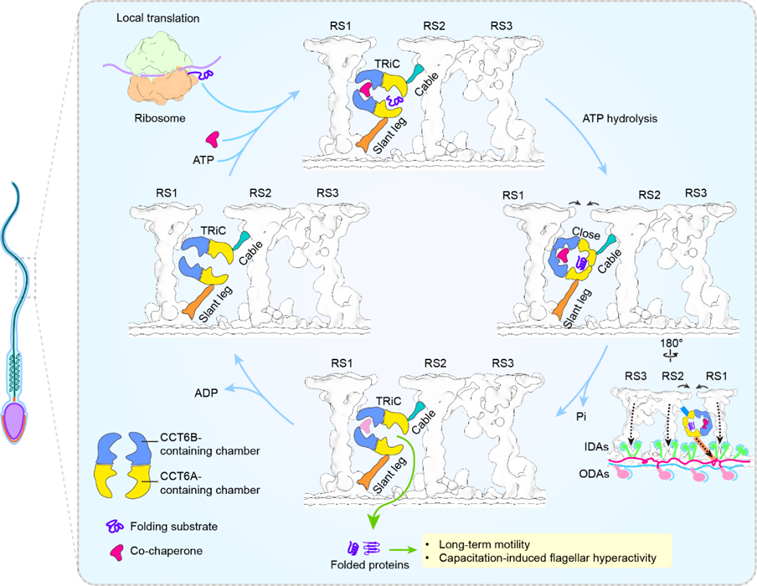 为验证RRB-TRiC的生理功能,团队靶向抑制TRiC的ATP酶活性,发现可显著抑制小鼠精子鞭毛摆动,但不影响缺乏RRB结构的斑马鱼精子运动,证实TRiC对维持哺乳动物精子运动具有重要作用。基于此提出:在持续机械运动中受损的轴丝组分可通过鞭毛内原位合成、邻近TRiC捕获并折叠的方式及时替换,从而维持鞭毛长期稳定摆动。
